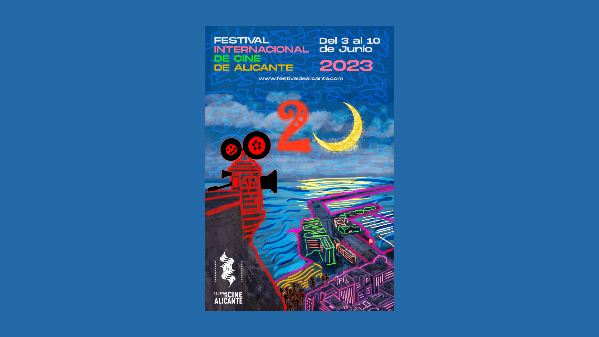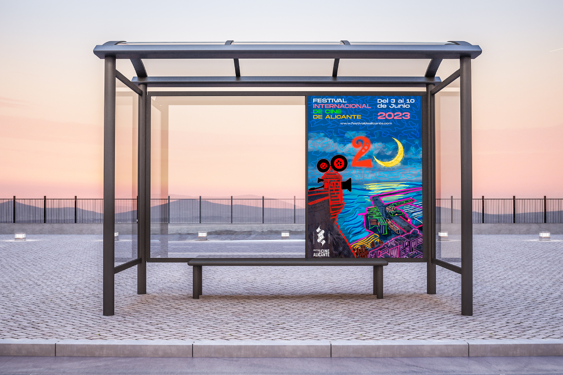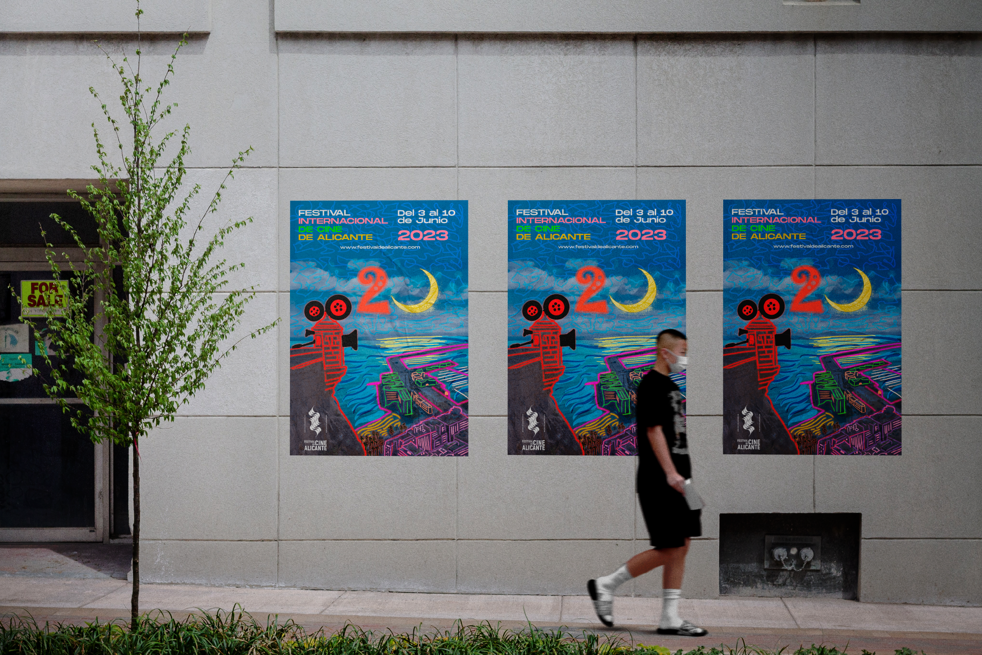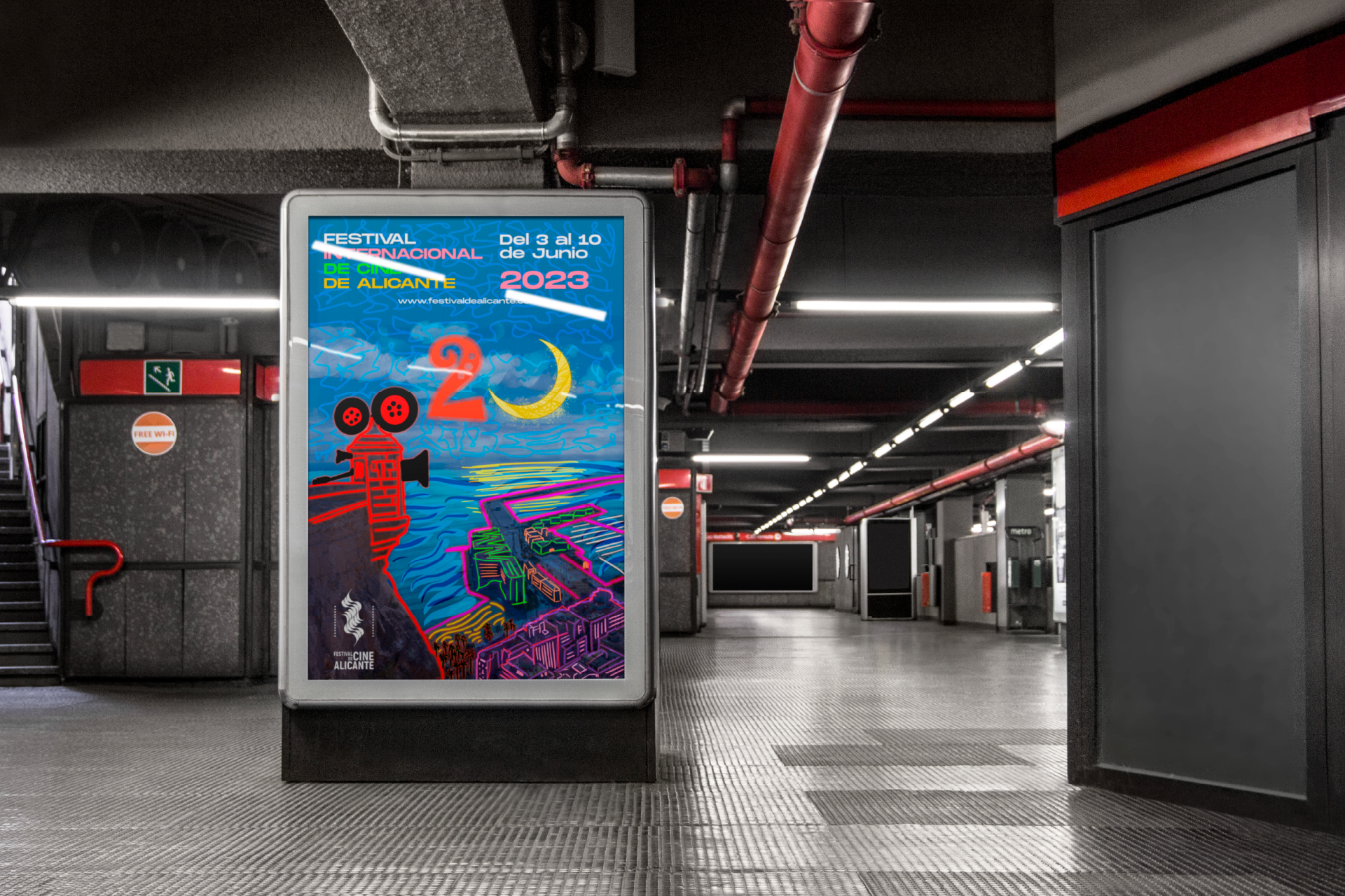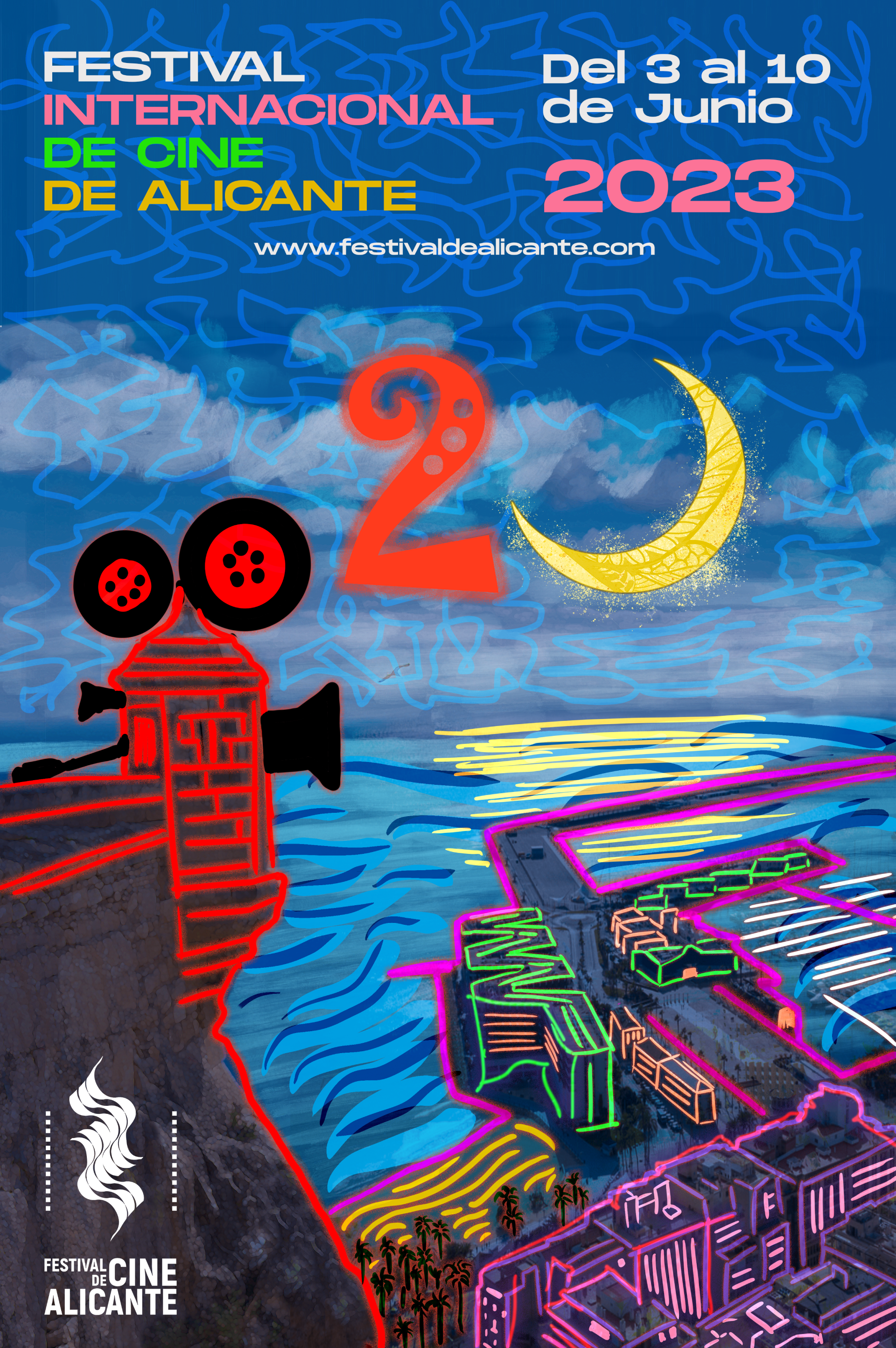 I did this poster for the 20th edition of Alicante International Film Festival 2023. I used wavy/irregular lines and florescent-style paints, both inspired by the sea and other famous landmarks in Alicante. I tried to reflect the independent/colorful vibe of the city and the film festival.